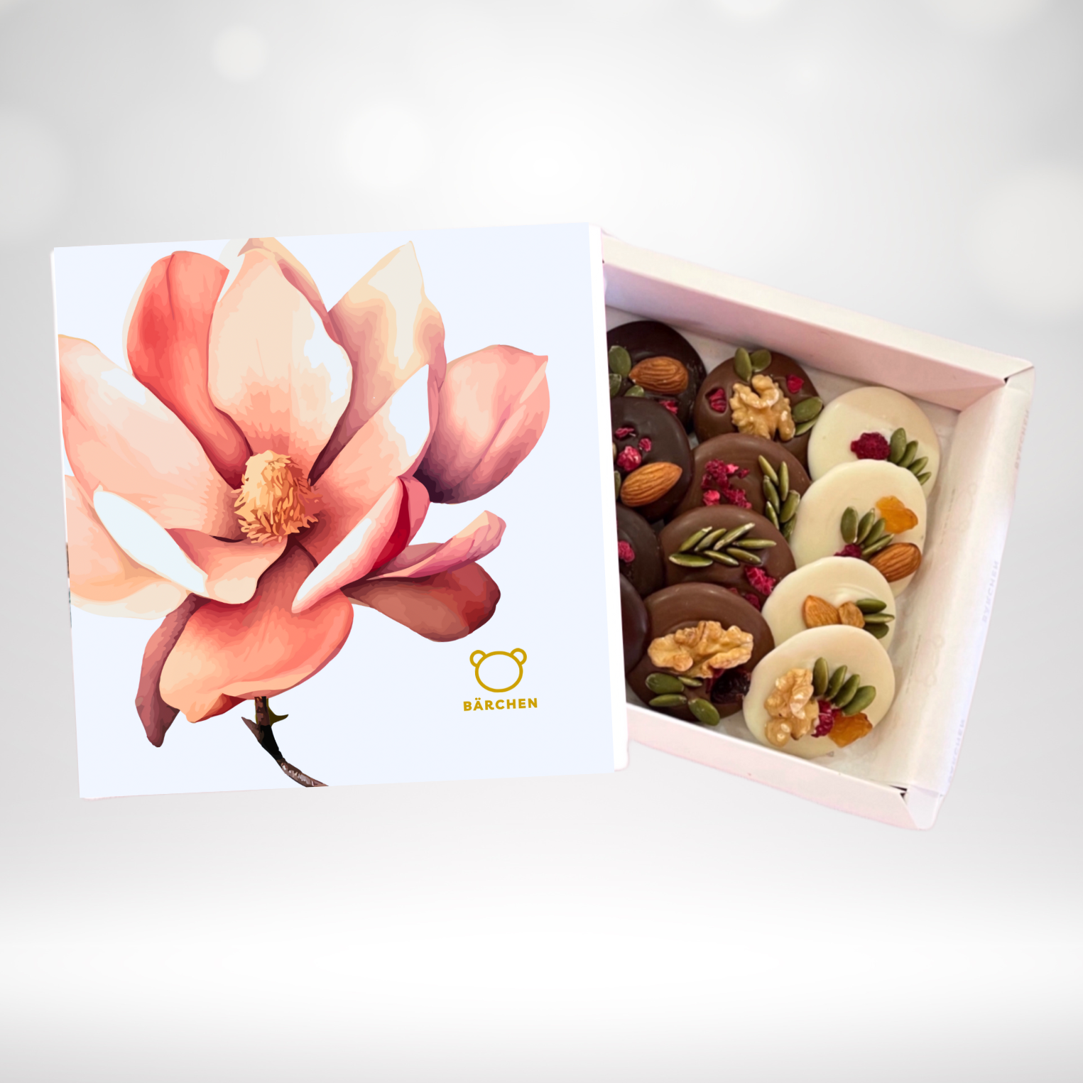 12 unidades Mendiants Chocolate Belga Semiamargo 58%, Leche 33% y Blanco 28% con frutos secos y frambuesas liofilizada . 210 grs